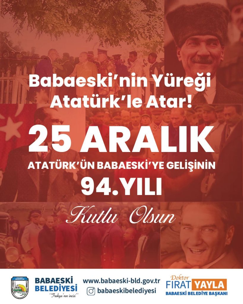 Babaeski Belediye Başkanı Dr. Fırat Yayla, Gazi Mustafa Kemal Atatürk’ün Babaeski’ye gelişinin 94. yıl dönümü vesilesiyle bir mesaj yayımladı.