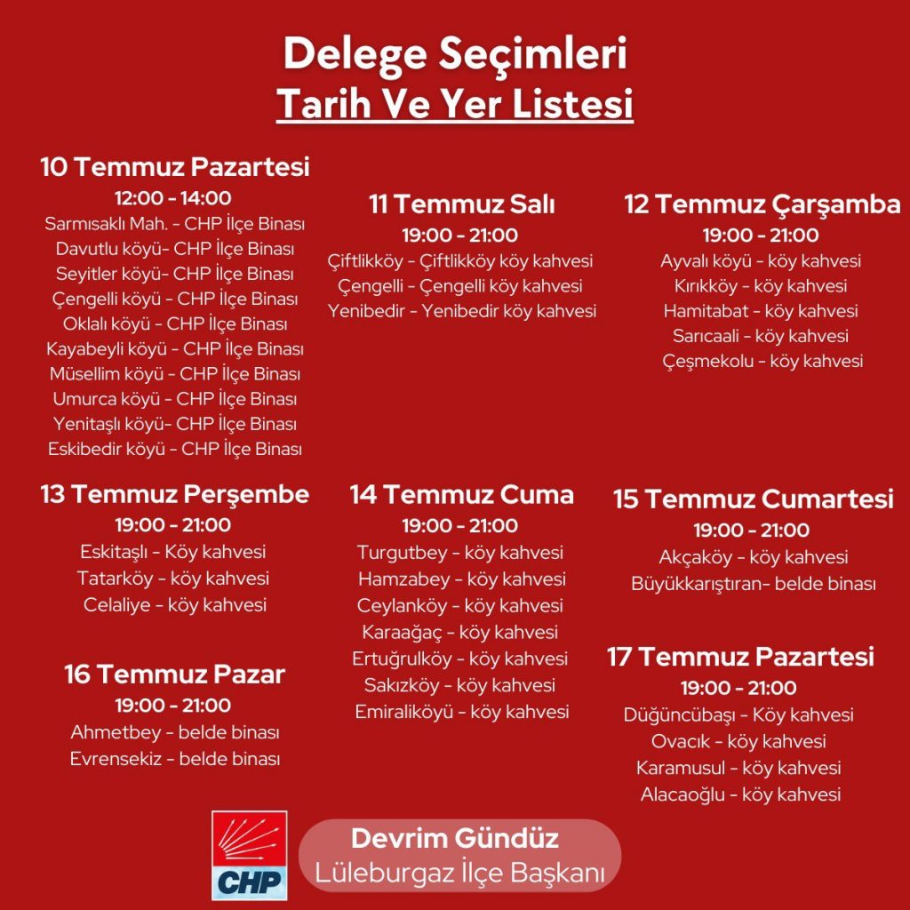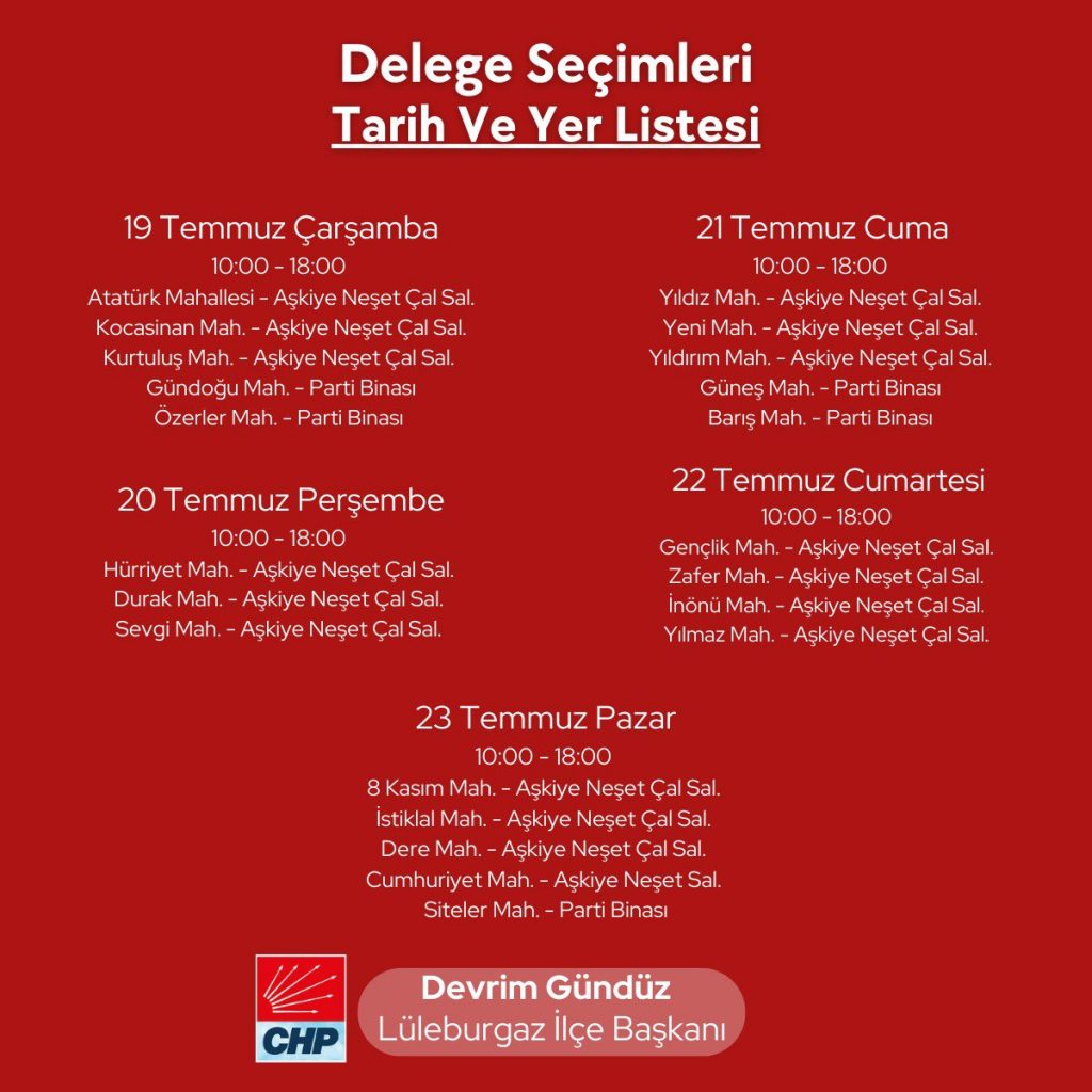 CHP Lüleburgaz İlçe Başkanı Devrim Gündüz; ‘’Mahalle, Köy ve Belde delege seçimlerimizin yer, tarih ve saatleri belli olmuştur. Hayırlı olmasını diliyorum’’ dedi.