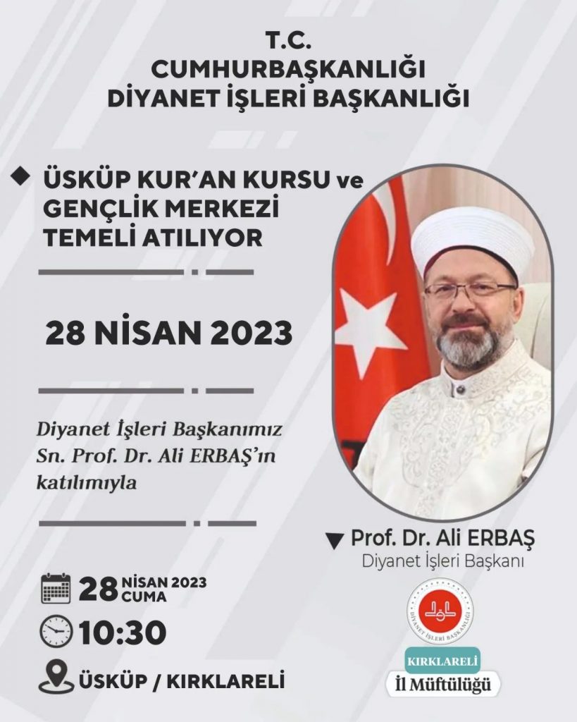 Diyanet İşleri Başkanı Prof. Dr. Ali Erbaş’ın katılımı ile temeli atılacak Üsküp Kur’an Kursu ve Gençlik Merkezi’nin temel atma töreni 28 Nisan Cuma(bugün) saat 10.30’da yapılacak. (Haber Merkezi)