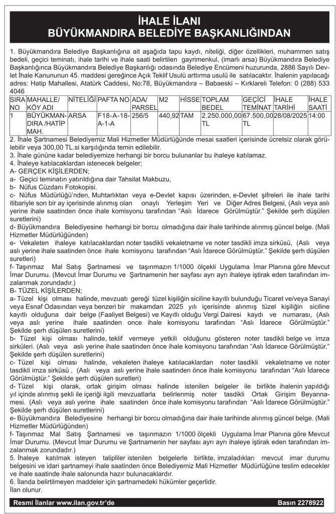 İHALE İLANI BÜYÜKMANDIRA BELEDİYE BAŞKANLIĞINDAN