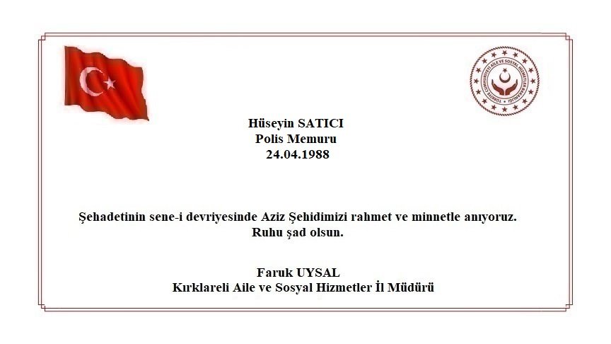 Kırklareli Aile ve Sosyal Hizmetler İl Müdürü Faruk Uysal, 24 Nisan 1988 yılında şehit olan Hüseyin Satıcı’yı şehadetinin seneyi devriyesinde rahmetle ve minnetle andıklarını ifade etti.