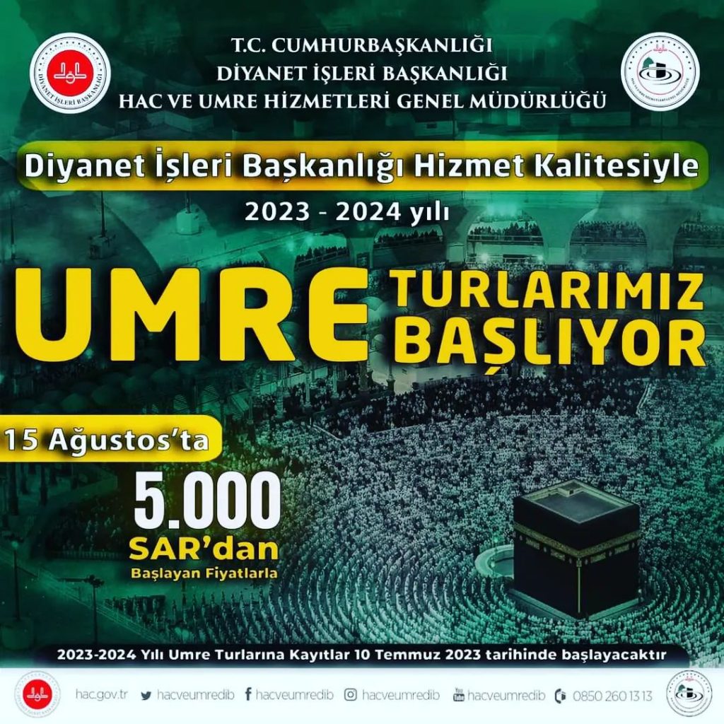 Kırklareli İl Müftülüğü; ‘’2023-2024 Umre dönemi, Diyanet İşleri Başkanlığı Hac ve Umre Hizmetleri Genel Müdürlüğü öncülüğünde 15 Ağustos 2023 tarihi itibariyle başlıyor İnşallah.